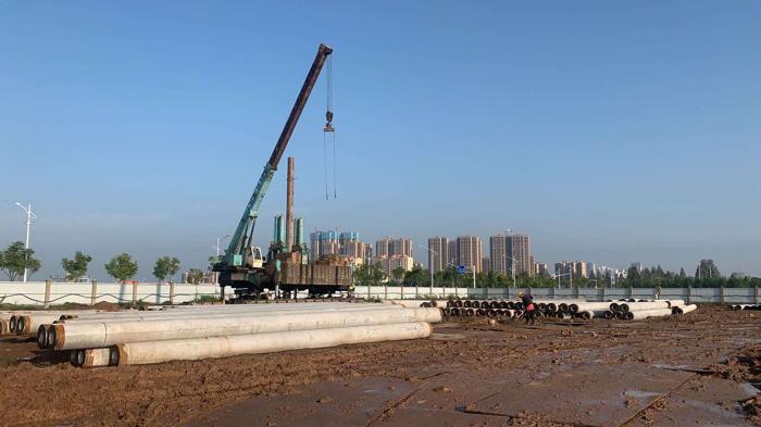 天公不作美,开工不到两天,就逢连日大雨,场地严重滞水,现场总包提供的临时土路,根本无法保证送桩车辆进出,且施工场地经雨水冲泡,静压设备行走举步维艰。为尽快推动施工作业正常化,项目部多措并举,一是积极与甲方、监理提出要求对施工场地进行硬化处理;二是在项目经理的带领下,全员严格执行项目策划工作安排,做到了步调一致,责任到人,分工明确,如及时安排人员抽排积水,且在主楼附近赶挖排水沟进行引水;进钢板铺设临时道路;挖机进场配合处理场地等。三是重点抓实了安全文明施工管理,对违规操作,严格责令班组整改到位;加强施工现场安全用电管理,架空电缆线,工作和生活区域严禁使用大功率电器;安排杂工对进出车辆进行彻底冲洗,严禁带泥上路。截止9月25日,累计完成212根管桩。